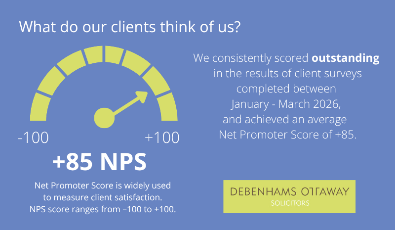 At the end of each matter, you’ll be invited to share your thoughts in a short online survey. It includes the Net Promoter Score (NPS), a trusted measure of client satisfaction used across many industries. NPS scores range from -100 to +100, and anything above 0 is considered good. We’re proud to consistently rank among the highest in the legal sector, with our client satisfaction surveys between January – March 2026 resulting in an excellent NPS of +85.